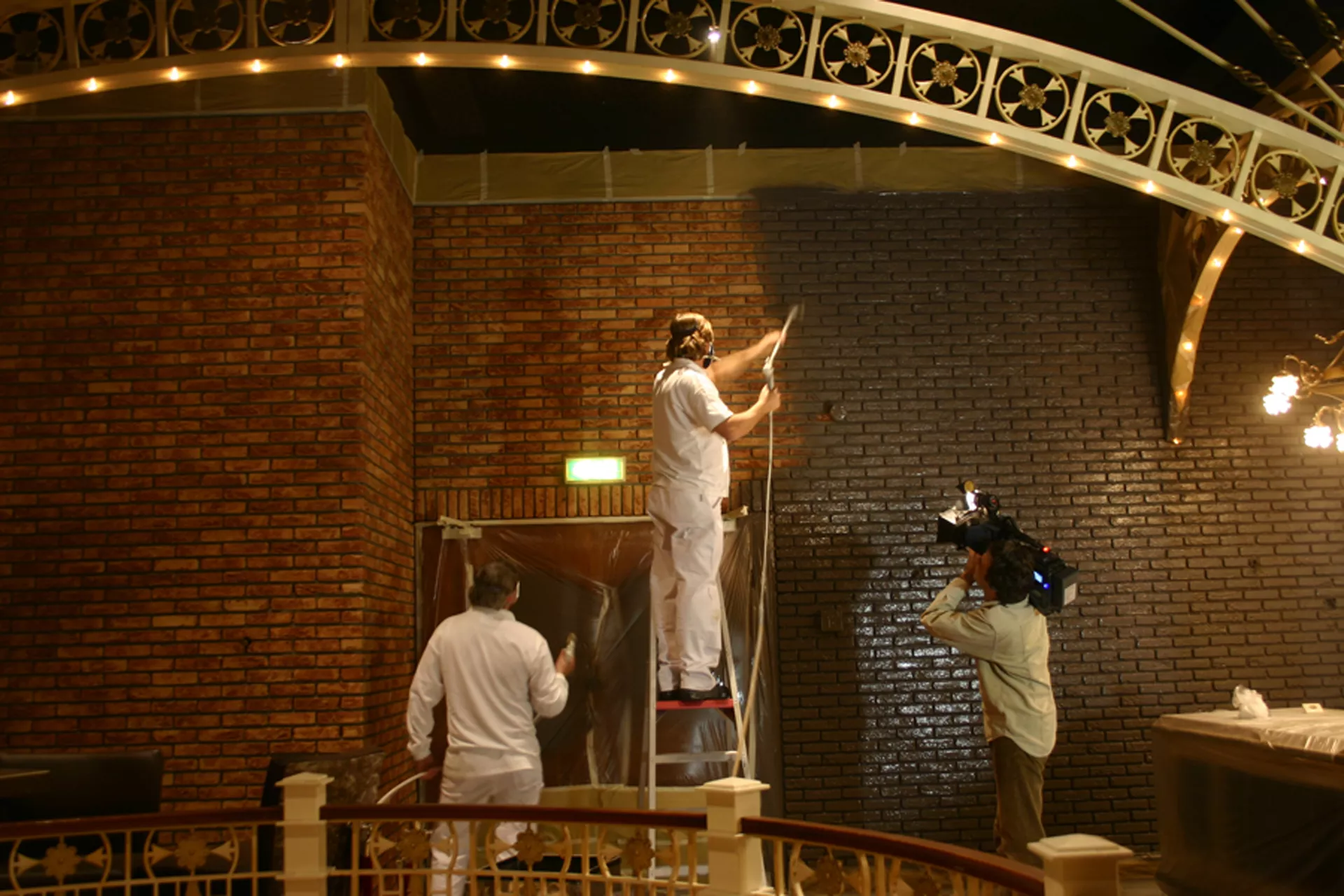 In de Ballroom hebben wij alle wanden gespoten in antracietkleur met afneembare zijdeglansverf. Het houtwerk en de metalen hekken zijn afgewerkt met hoogglanswit, wat zorgt voor een strakke en moderne uitstraling.