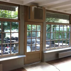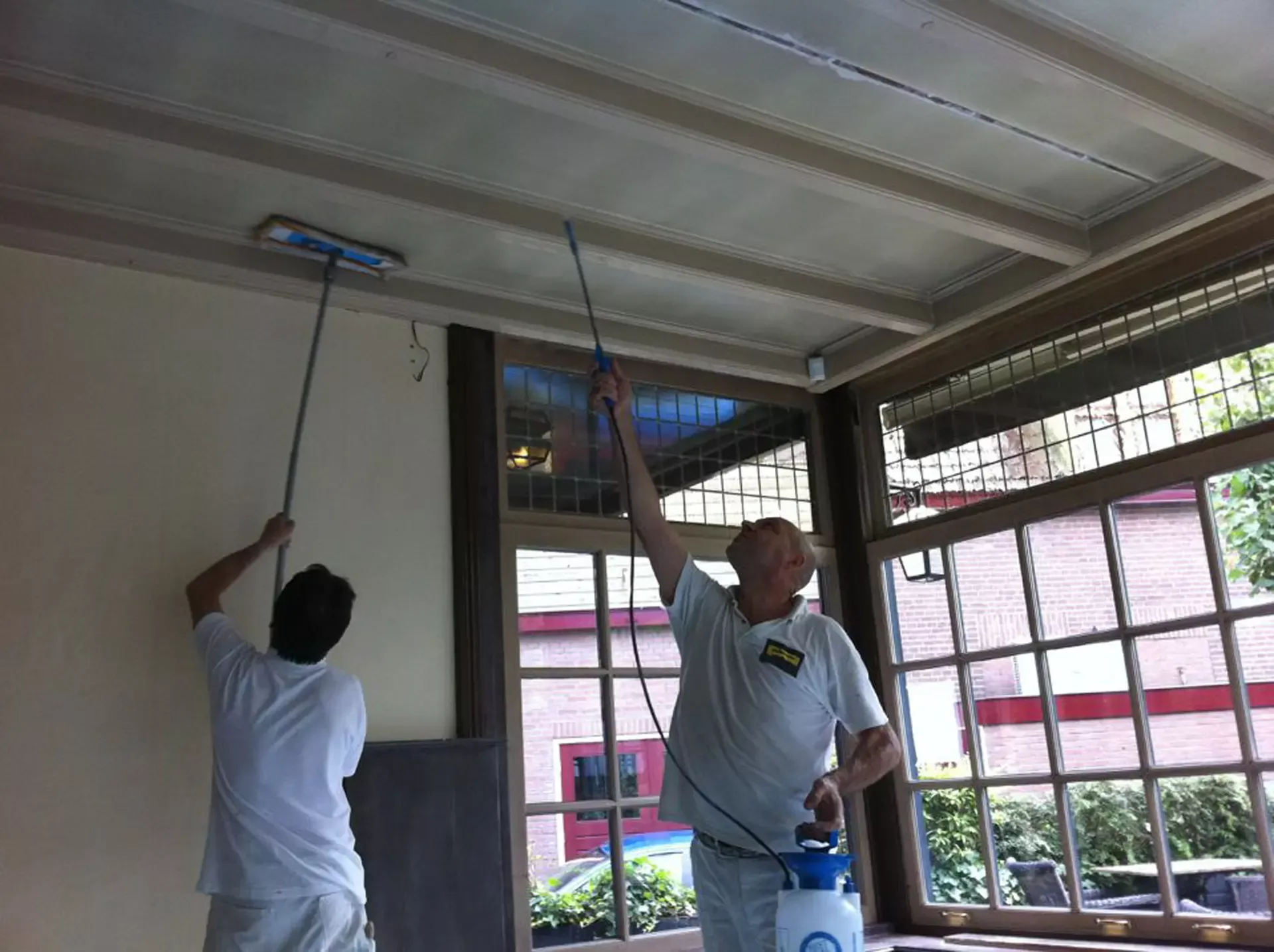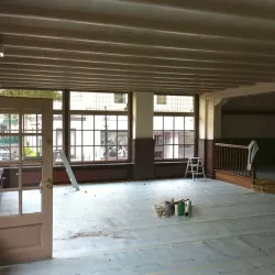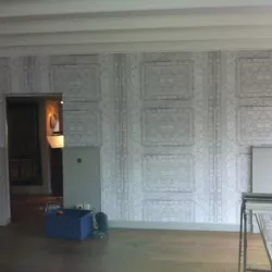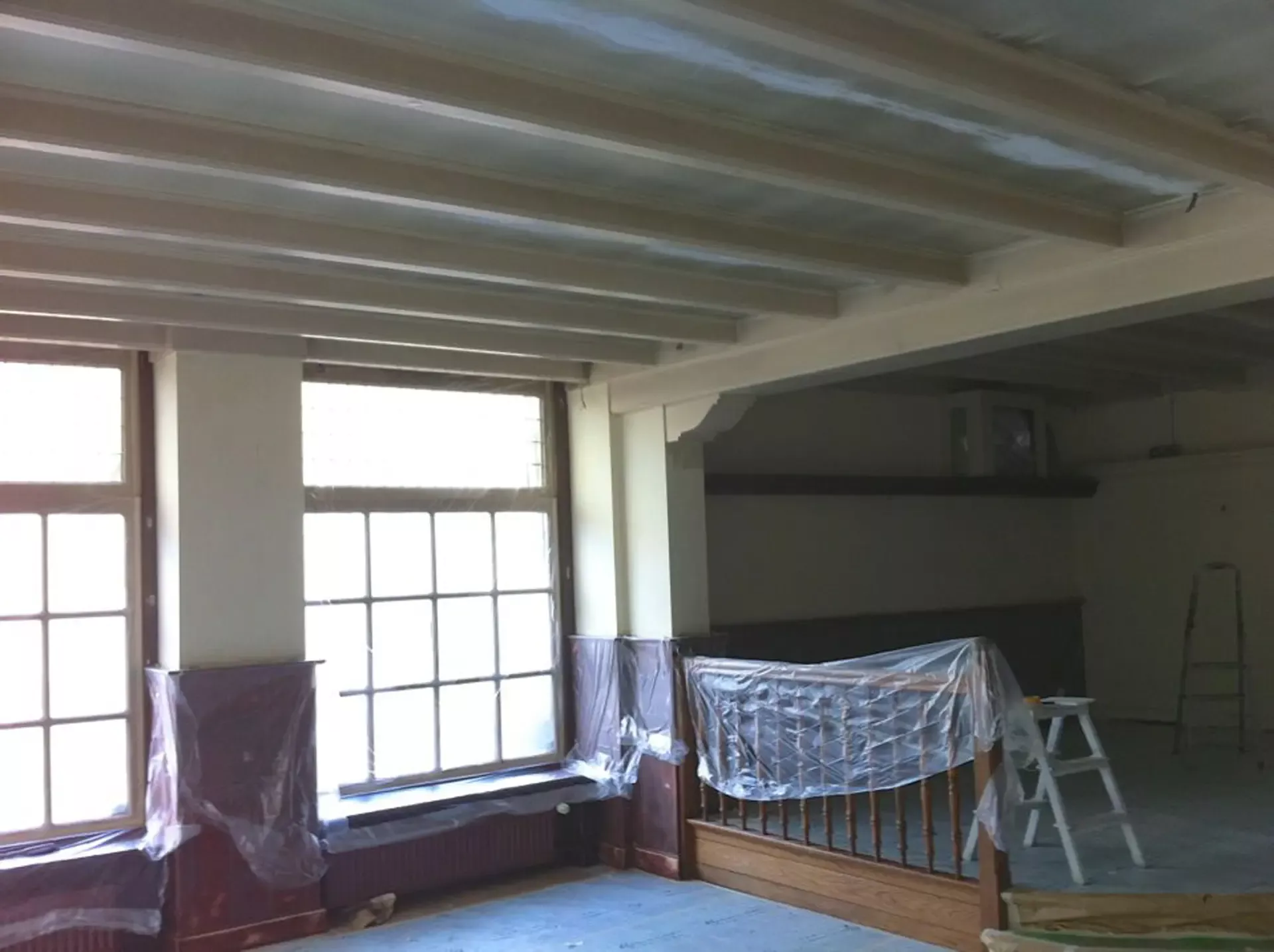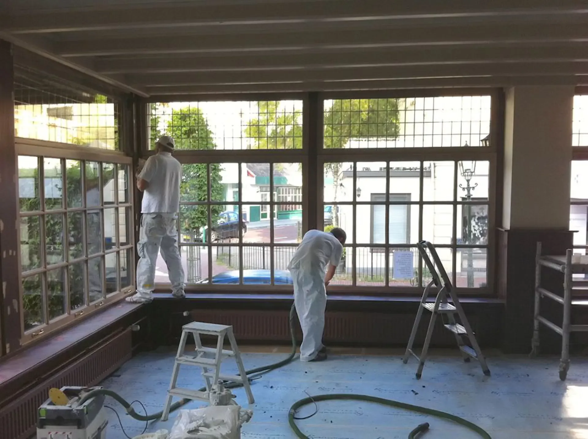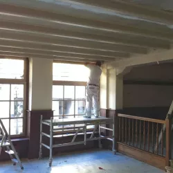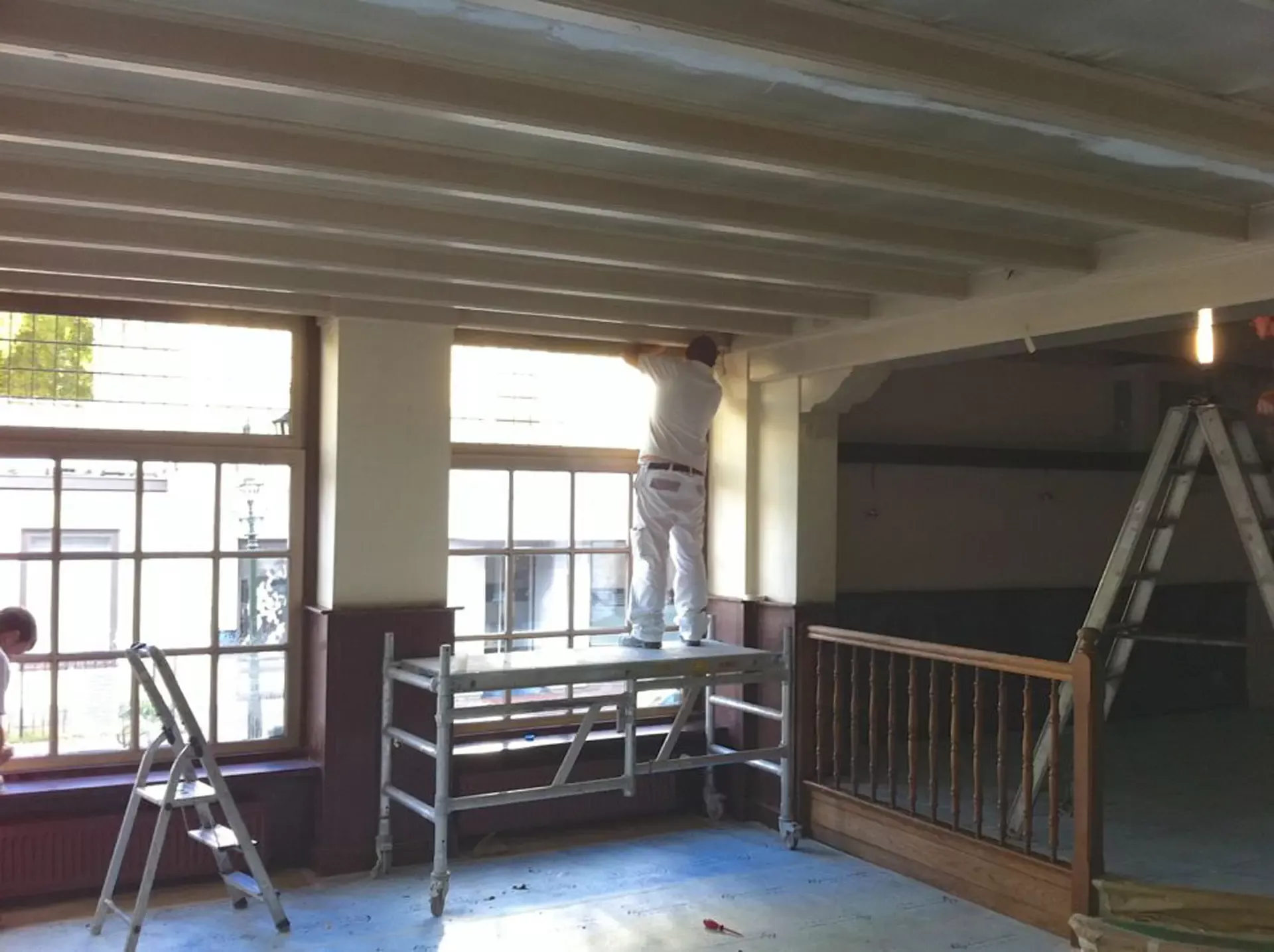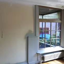 Eerst hebben we alle plafonds en wanden gereinigd om de nicotine-aanslag, afkomstig uit een tijd waarin dit nog mogelijk was, te verwijderen. Vervolgens hebben we de wanden, plafonds en het houtwerk behandeld met een isolerende primer. Het houtwerk is daarna gespoten met zijdeglansverf, de plafonds met matte muurverf, en de wanden zijn opnieuw gestuukt en voorzien van fris nieuw behang.