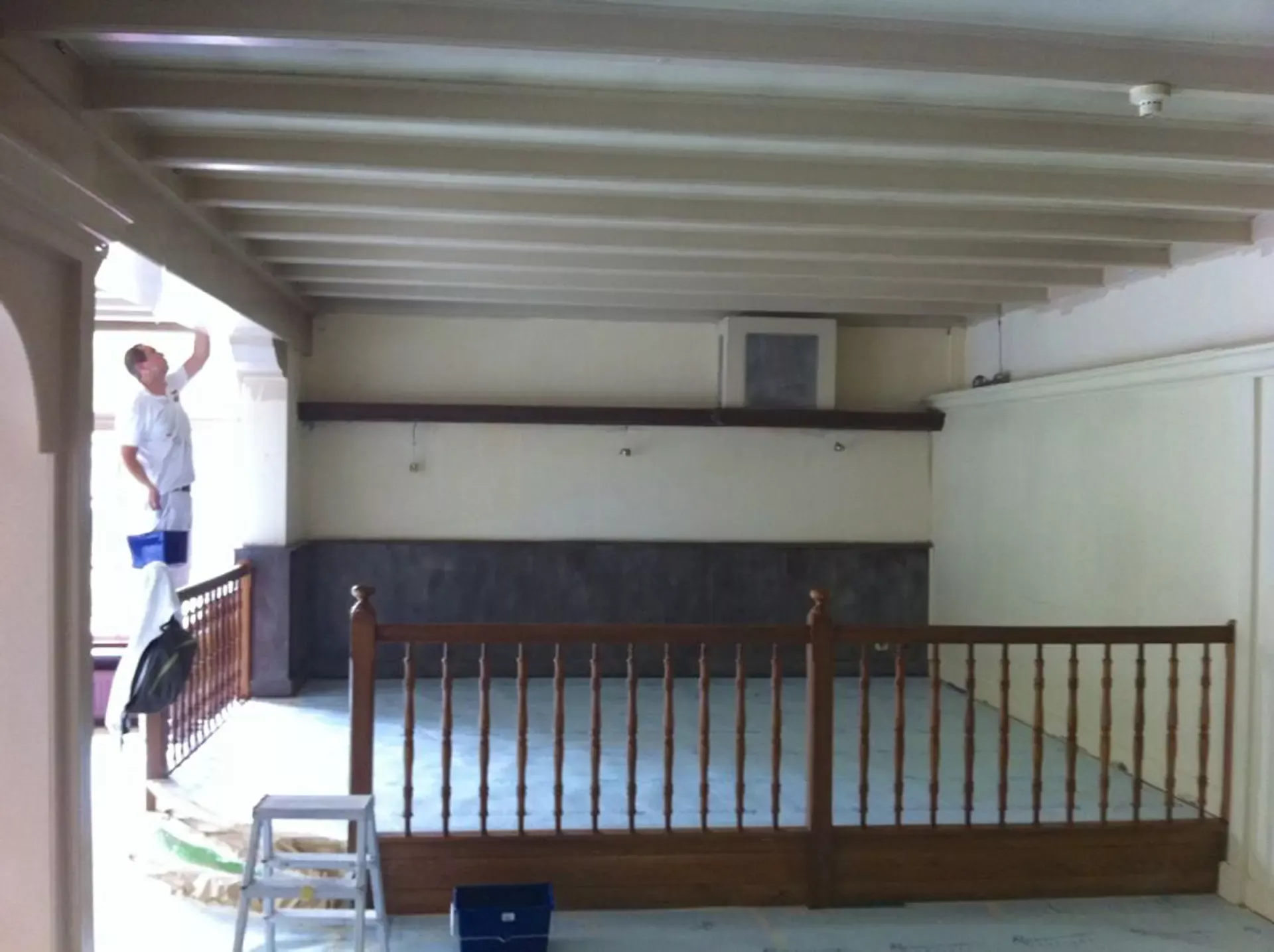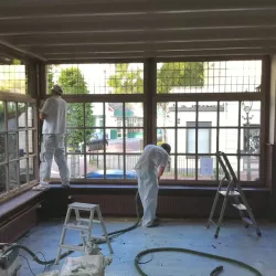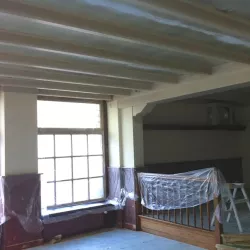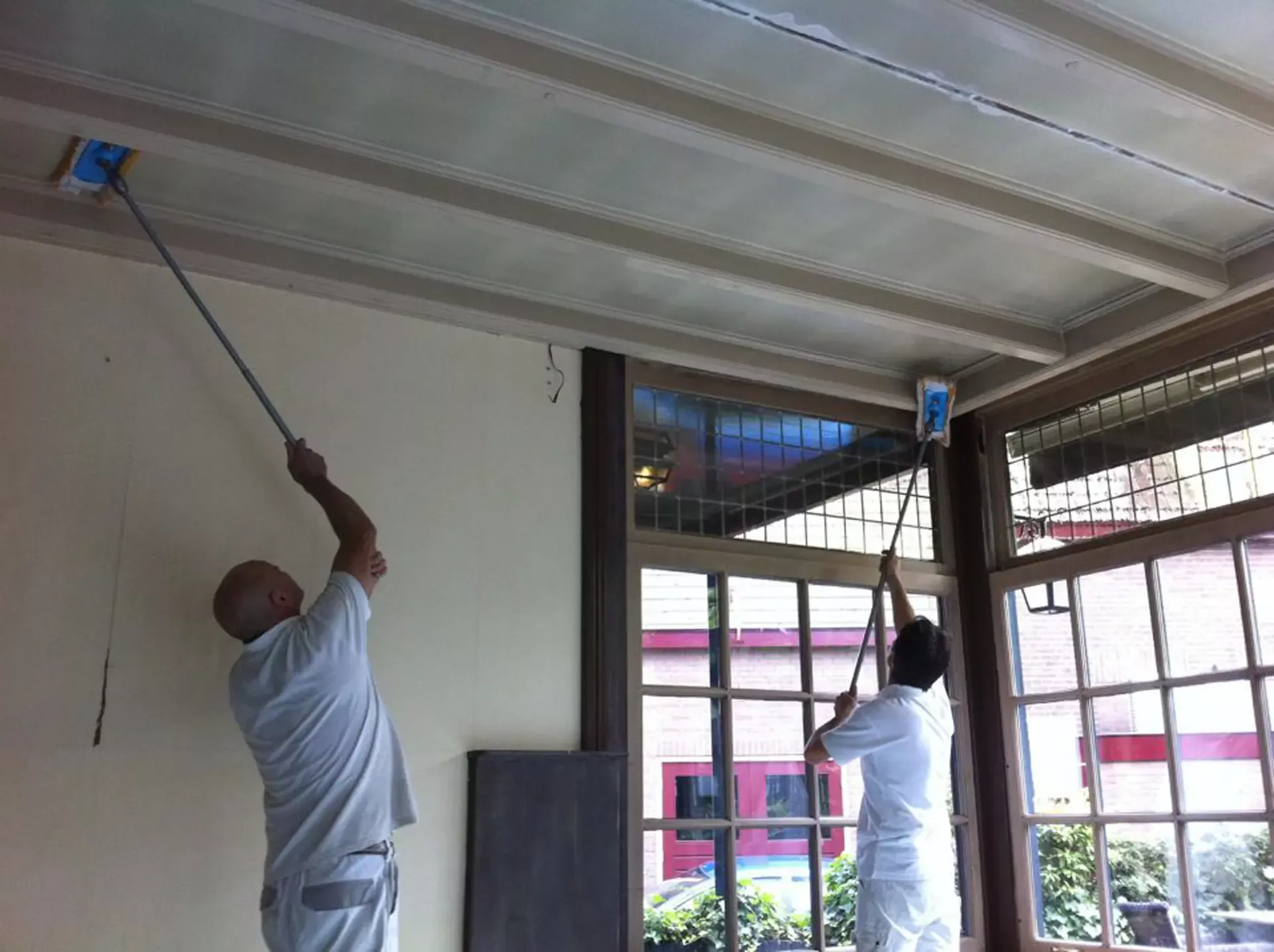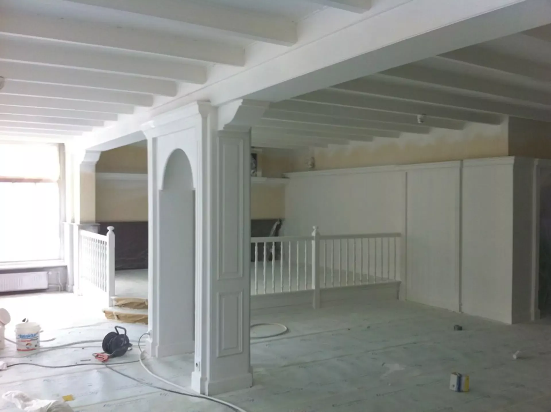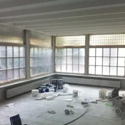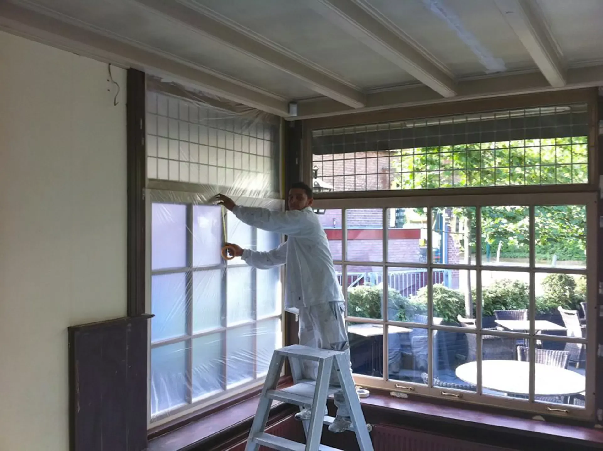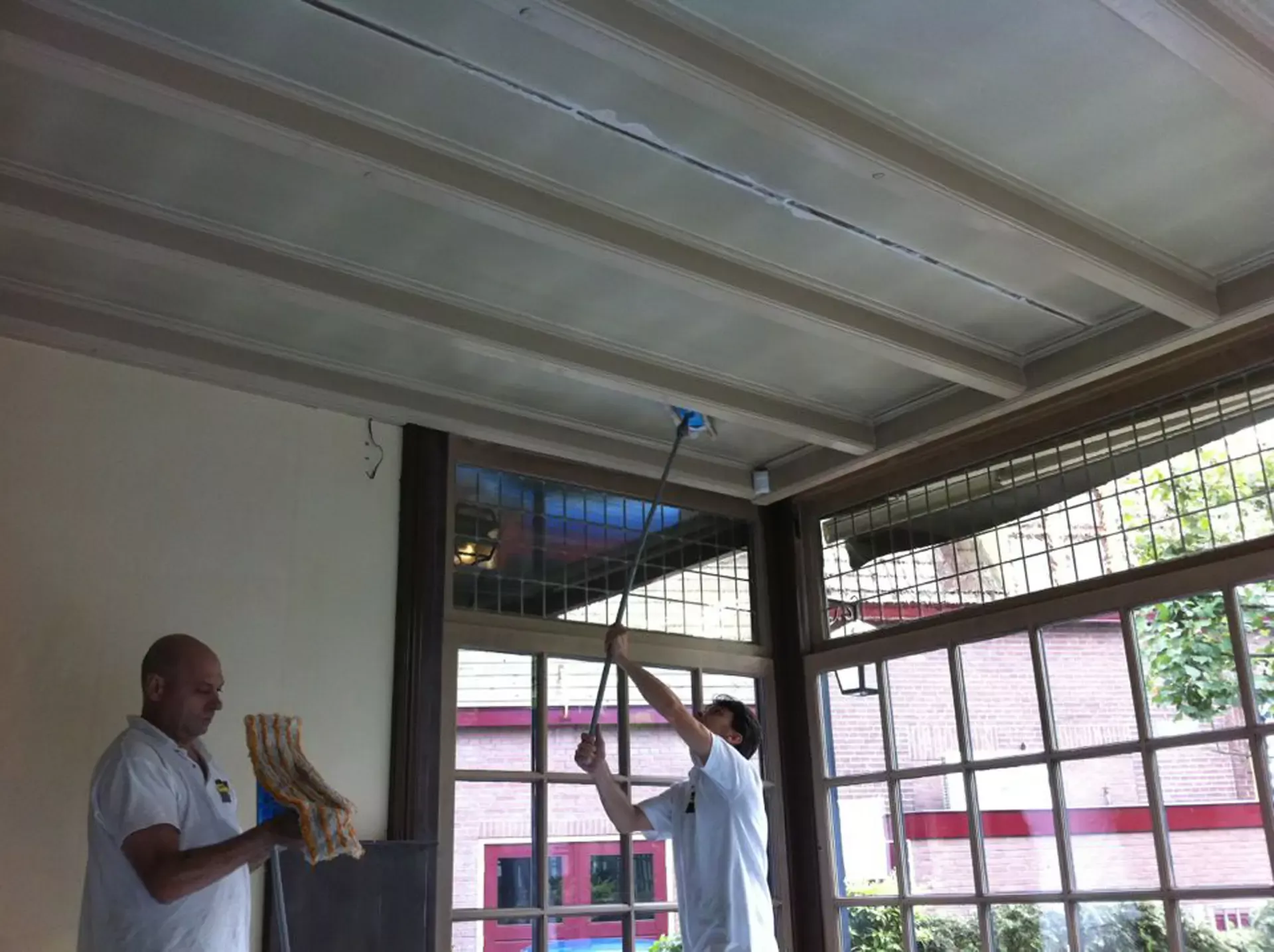 Eerst hebben we alle plafonds en wanden gereinigd om de nicotine-aanslag, afkomstig uit een tijd waarin dit nog mogelijk was, te verwijderen. Vervolgens hebben we de wanden, plafonds en het houtwerk behandeld met een isolerende primer. Het houtwerk is daarna gespoten met zijdeglansverf, de plafonds met matte muurverf, en de wanden zijn opnieuw gestuukt en voorzien van fris nieuw behang.