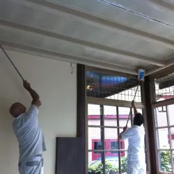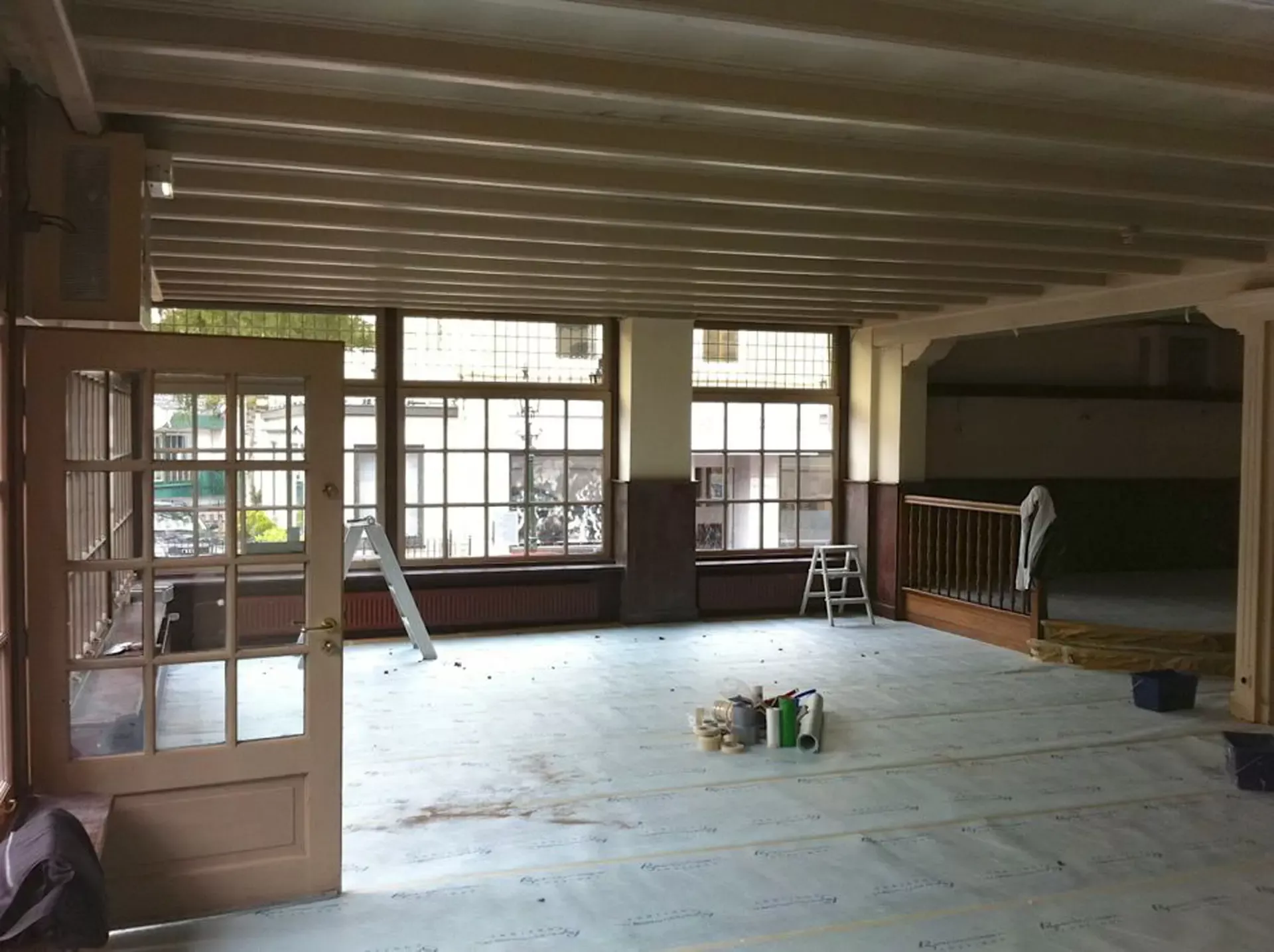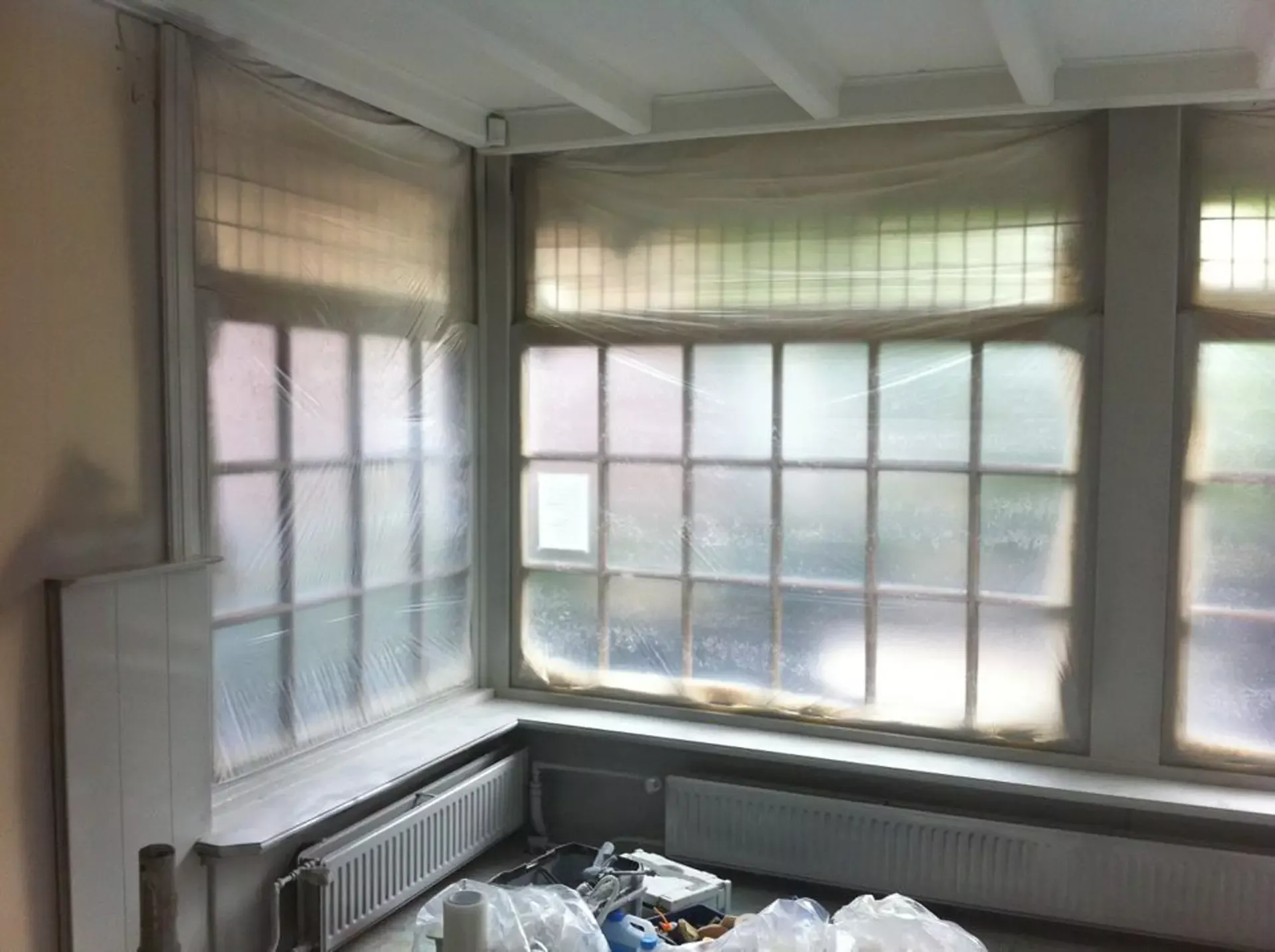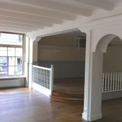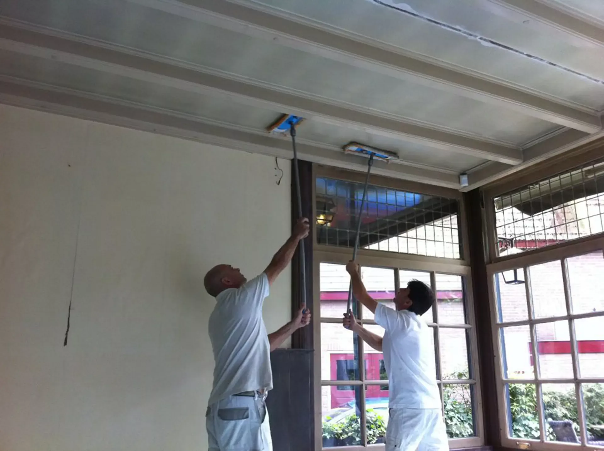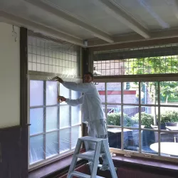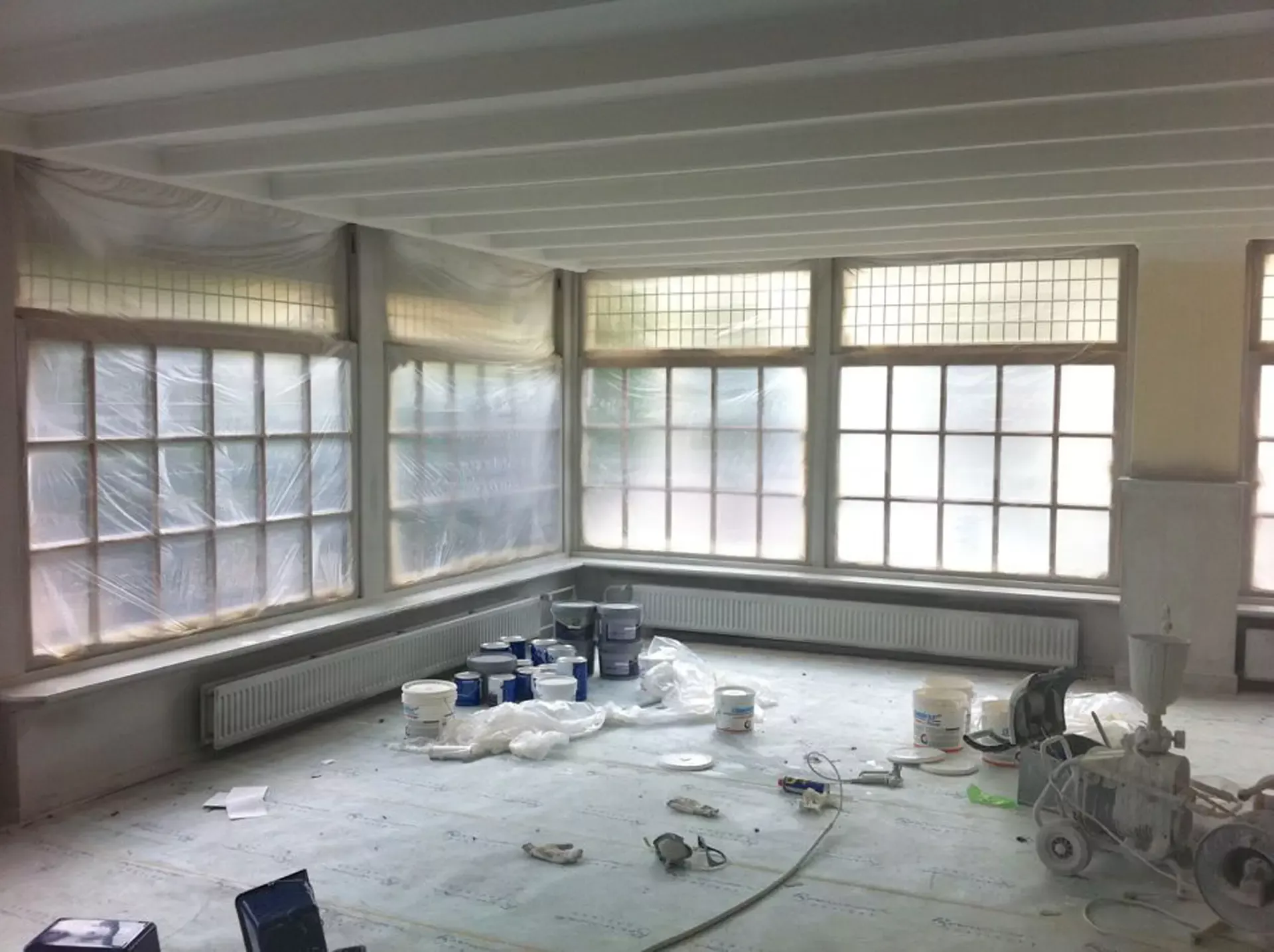 Eerst hebben we alle plafonds en wanden gereinigd om de nicotine-aanslag, afkomstig uit een tijd waarin dit nog mogelijk was, te verwijderen. Vervolgens hebben we de wanden, plafonds en het houtwerk behandeld met een isolerende primer. Het houtwerk is daarna gespoten met zijdeglansverf, de plafonds met matte muurverf, en de wanden zijn opnieuw gestuukt en voorzien van fris nieuw behang.