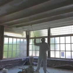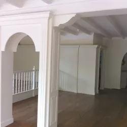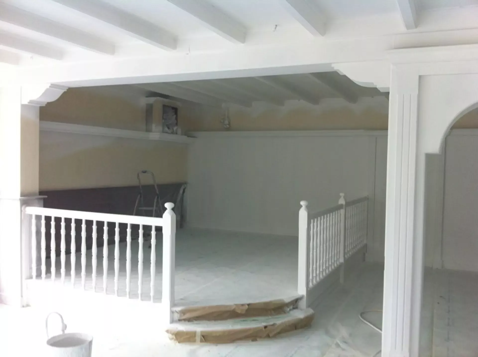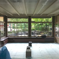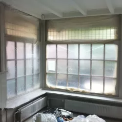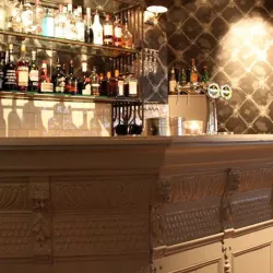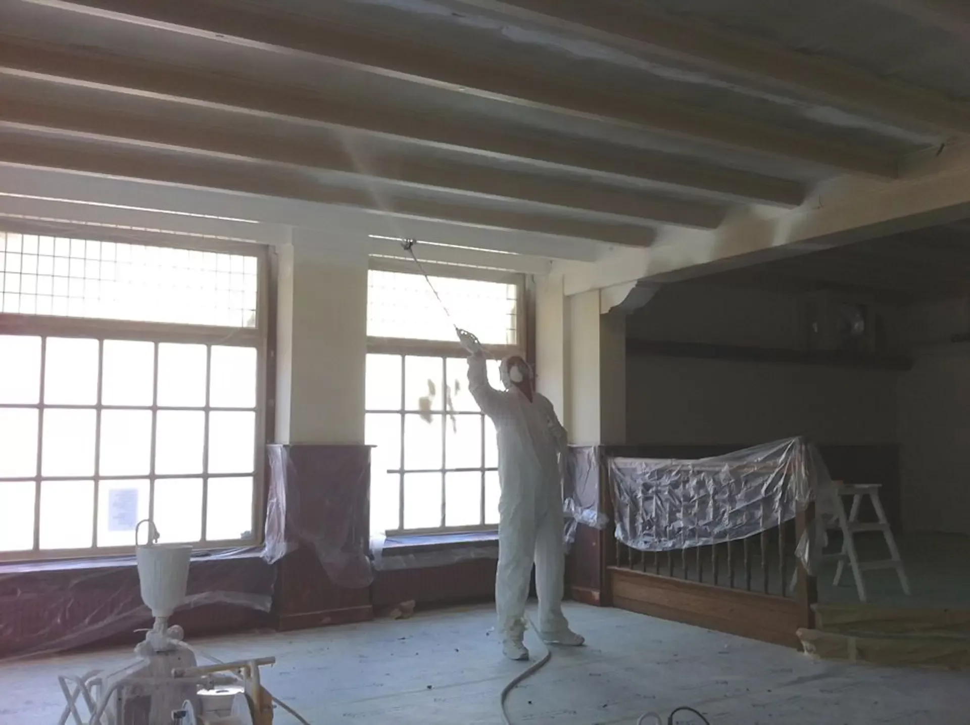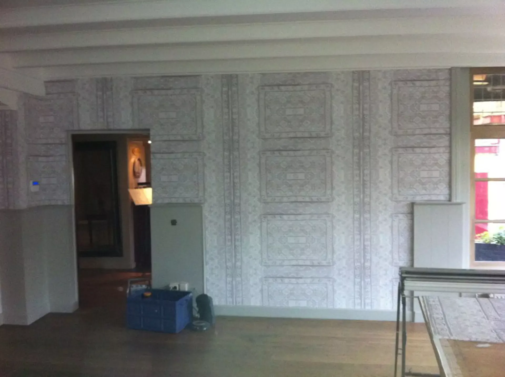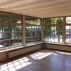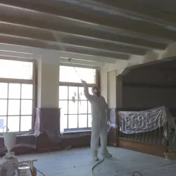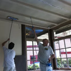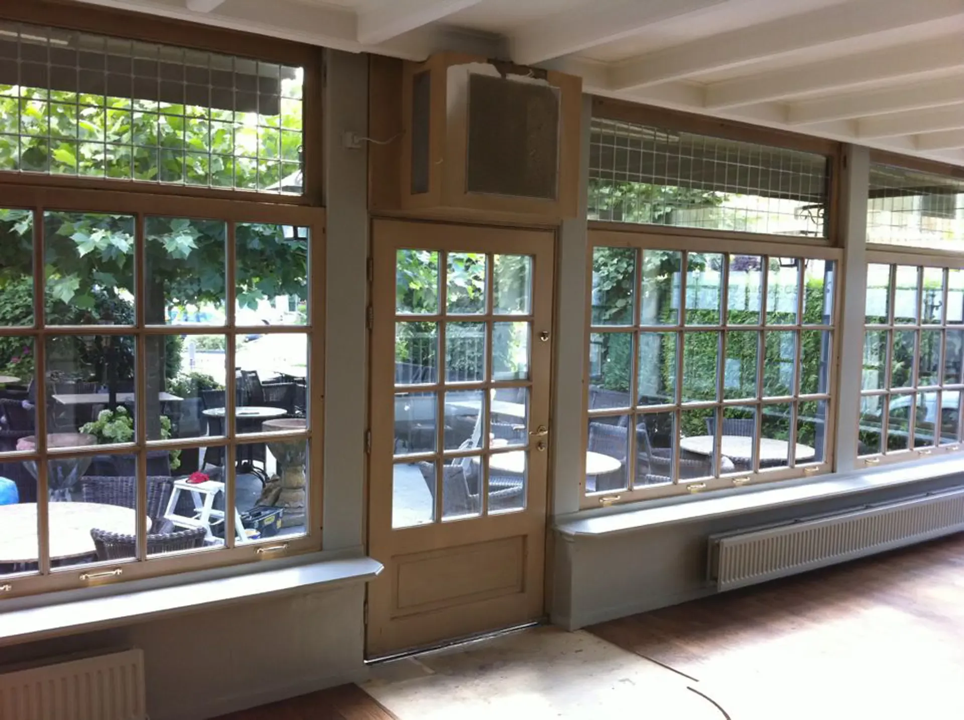 Eerst hebben we alle plafonds en wanden gereinigd om de nicotine-aanslag, afkomstig uit een tijd waarin dit nog mogelijk was, te verwijderen. Vervolgens hebben we de wanden, plafonds en het houtwerk behandeld met een isolerende primer. Het houtwerk is daarna gespoten met zijdeglansverf, de plafonds met matte muurverf, en de wanden zijn opnieuw gestuukt en voorzien van fris nieuw behang.