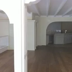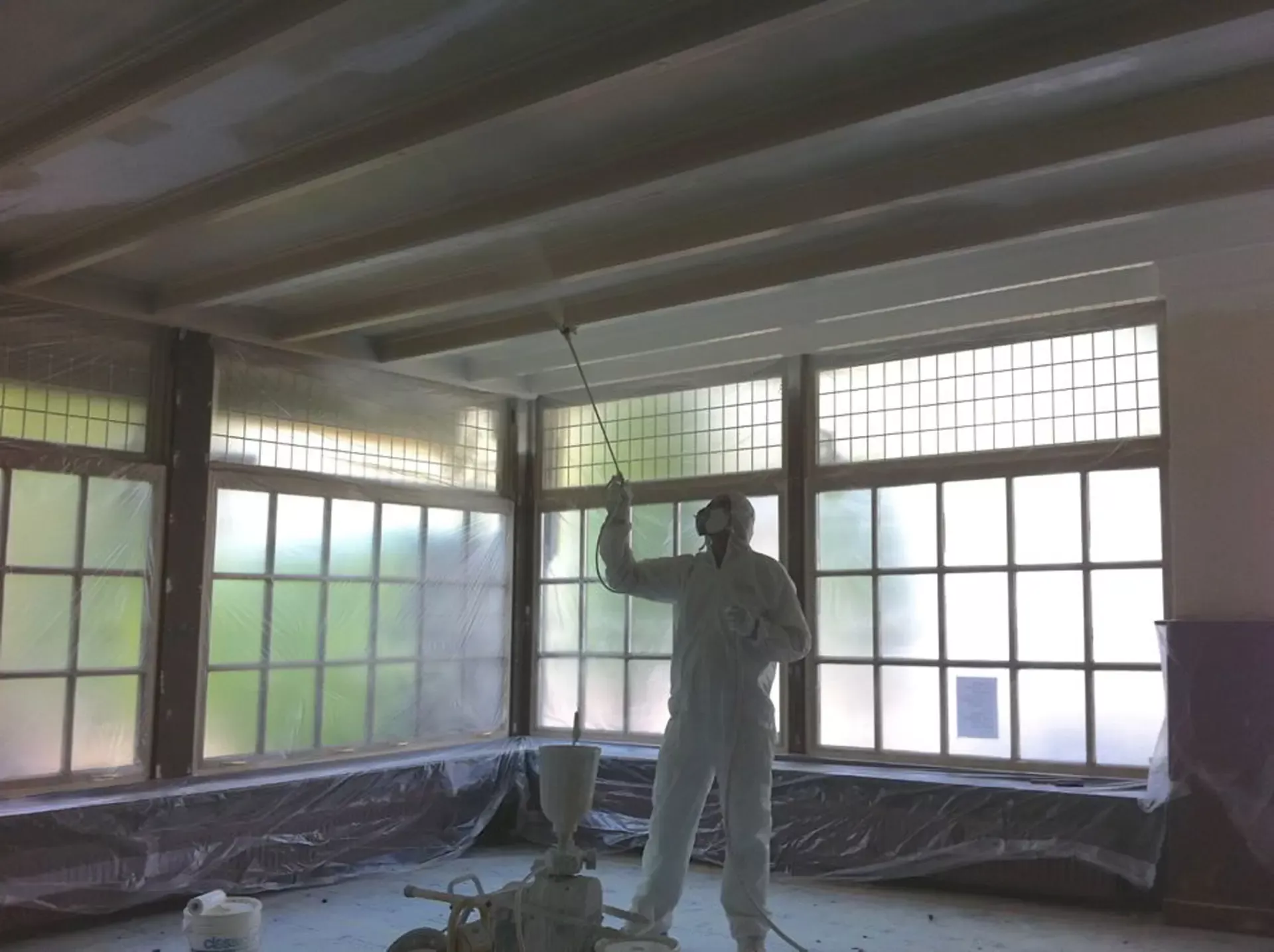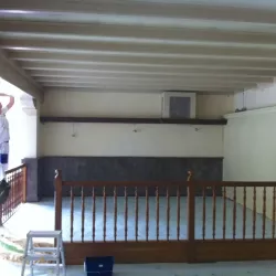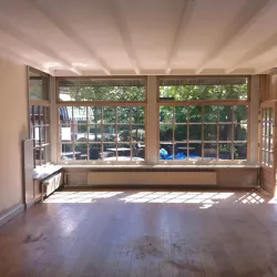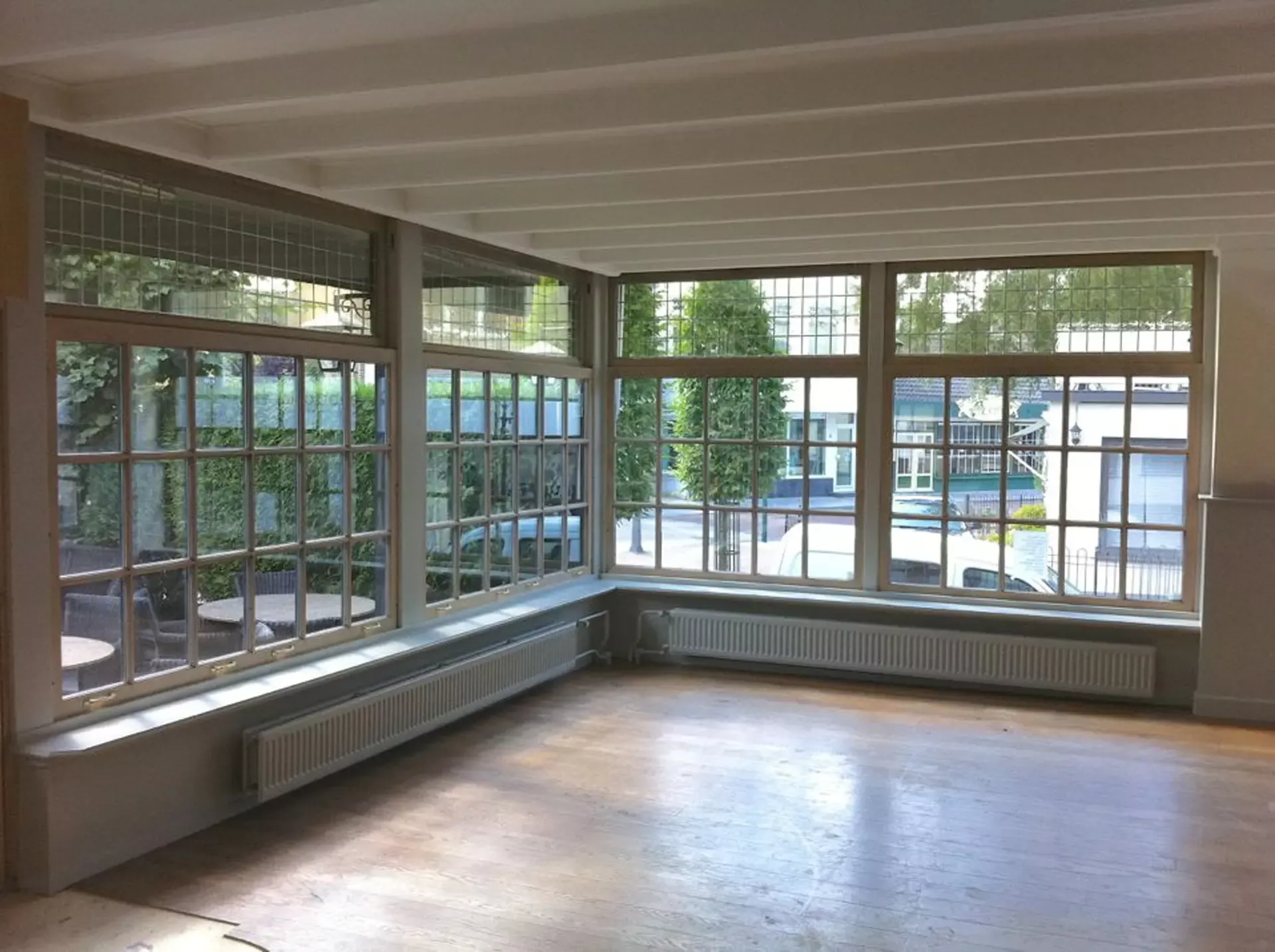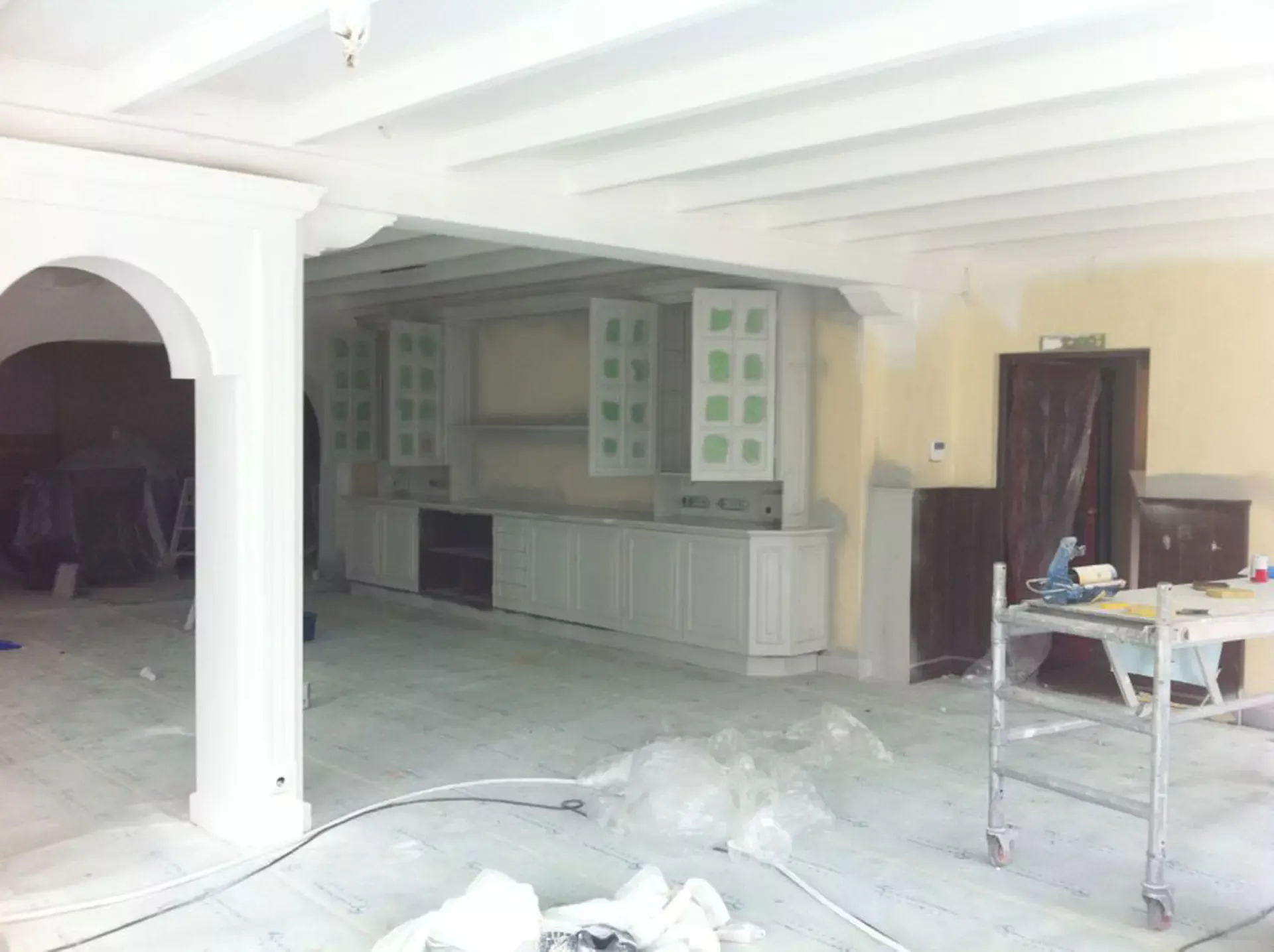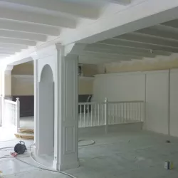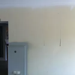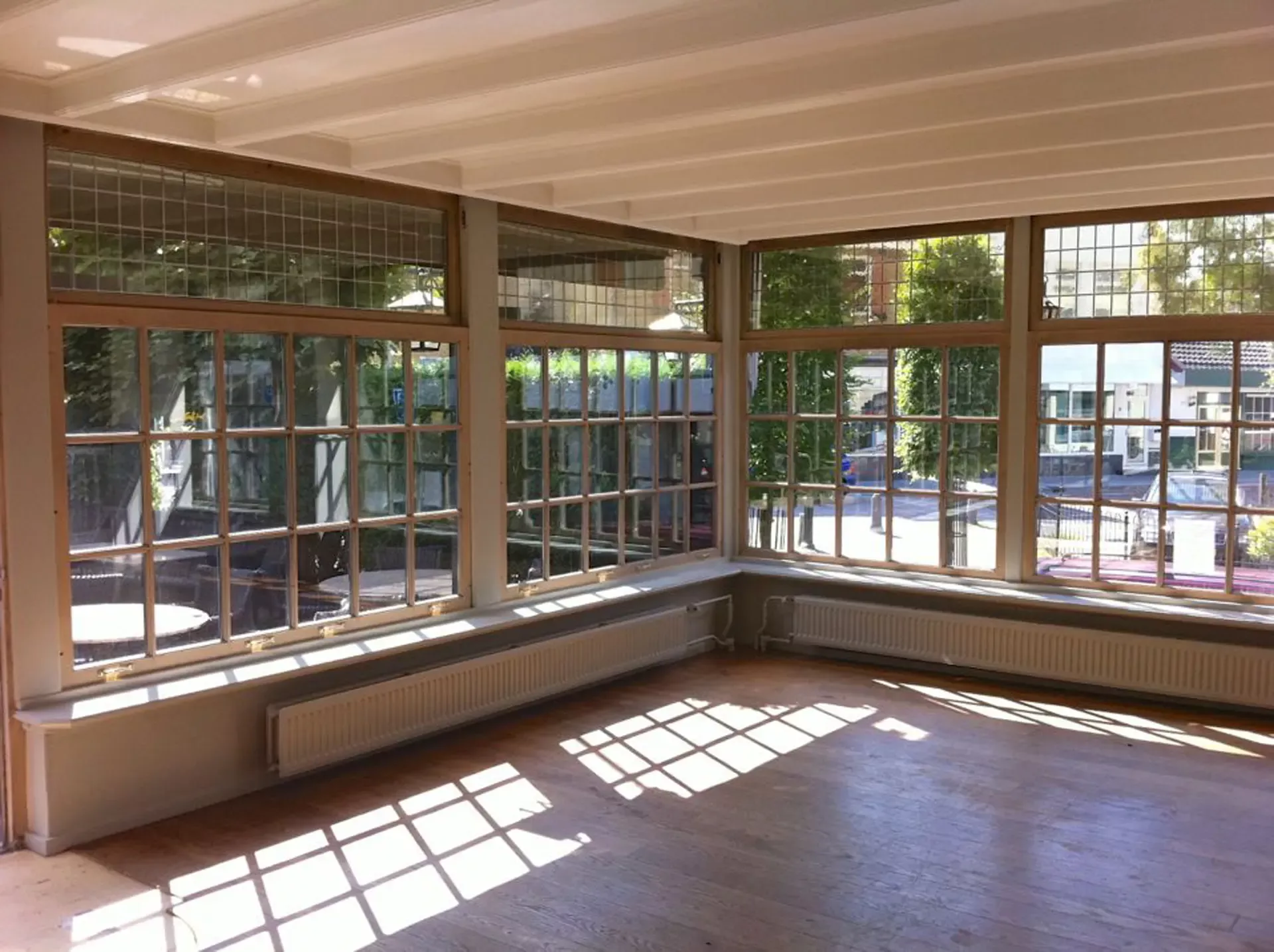 Eerst hebben we alle plafonds en wanden gereinigd om de nicotine-aanslag, afkomstig uit een tijd waarin dit nog mogelijk was, te verwijderen. Vervolgens hebben we de wanden, plafonds en het houtwerk behandeld met een isolerende primer. Het houtwerk is daarna gespoten met zijdeglansverf, de plafonds met matte muurverf, en de wanden zijn opnieuw gestuukt en voorzien van fris nieuw behang.