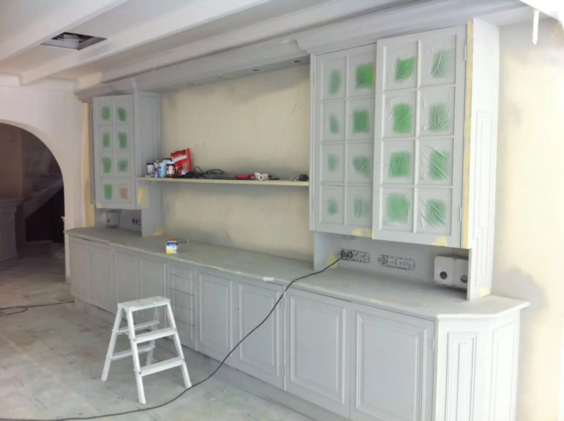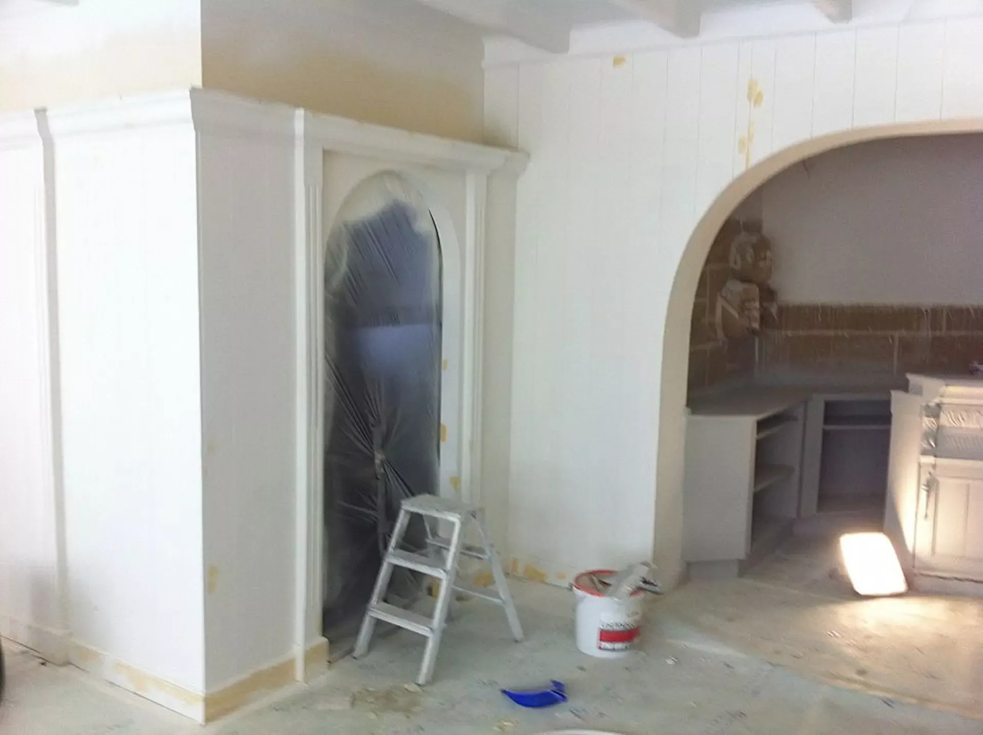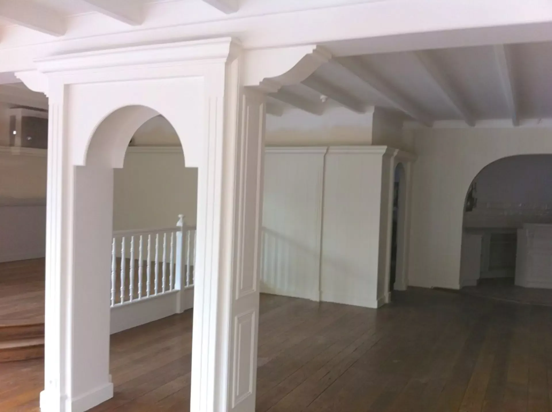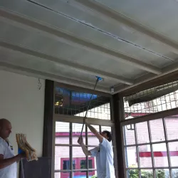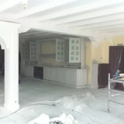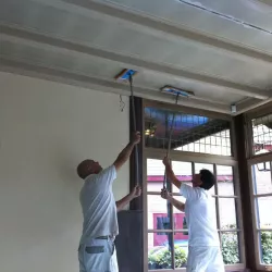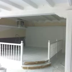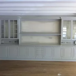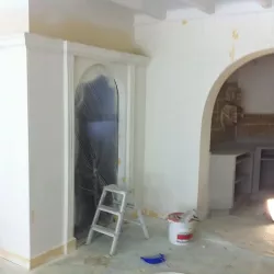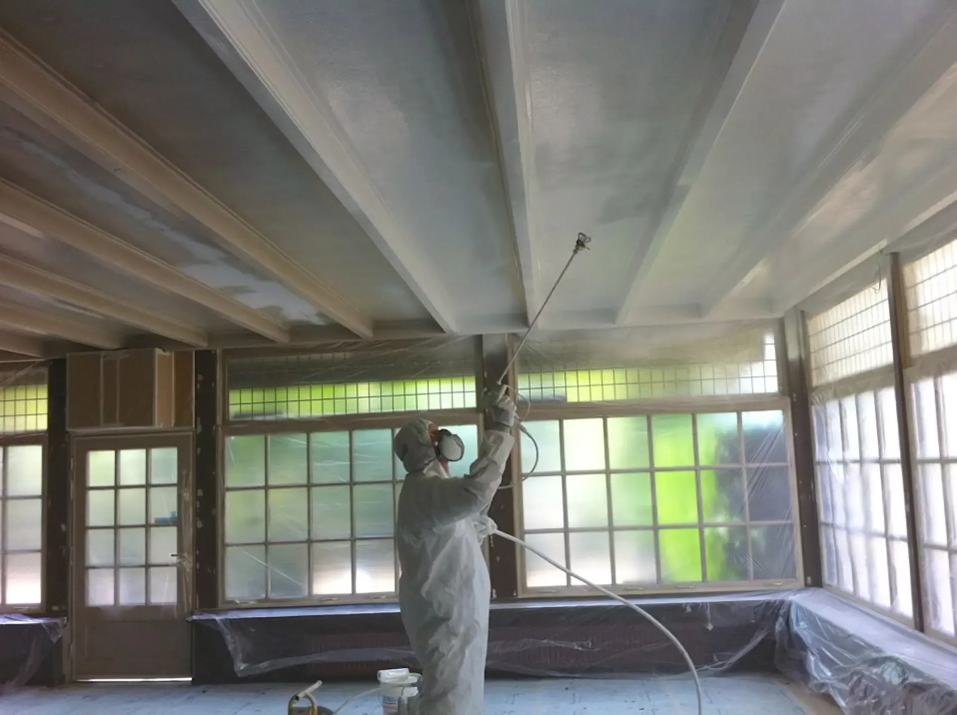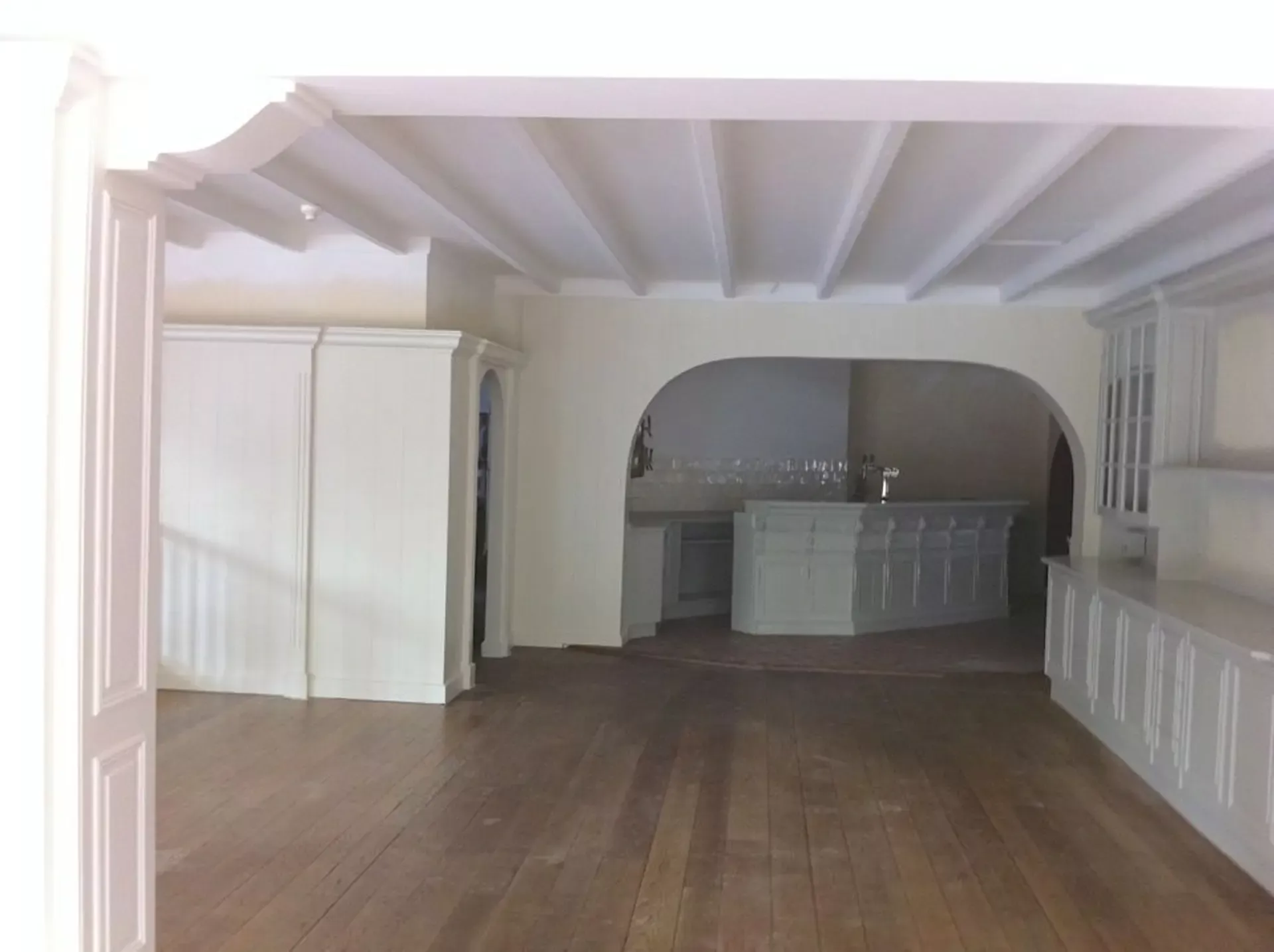 Eerst hebben we alle plafonds en wanden gereinigd om de nicotine-aanslag, afkomstig uit een tijd waarin dit nog mogelijk was, te verwijderen. Vervolgens hebben we de wanden, plafonds en het houtwerk behandeld met een isolerende primer. Het houtwerk is daarna gespoten met zijdeglansverf, de plafonds met matte muurverf, en de wanden zijn opnieuw gestuukt en voorzien van fris nieuw behang.
